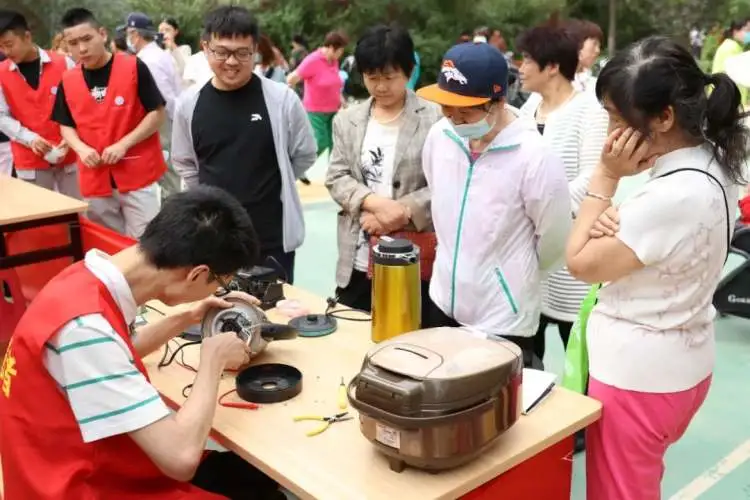 活动中,志愿者们运用自己的专业知识,为居民耐心地维修电风扇、电饭锅、水壶等家用电器,让原本废弃的电器,重新获得了使用价值。