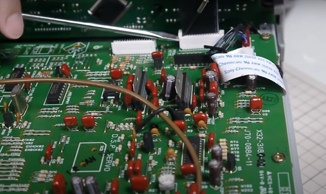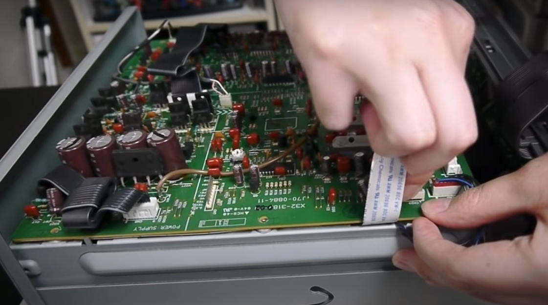 从上面看不到机芯,得揭开电路板才可以看到,首先把和前面板的连线用平口螺丝刀翘起,就可以抽下面板排线,侧面还有一根光头连接扁线。一并拆下。
