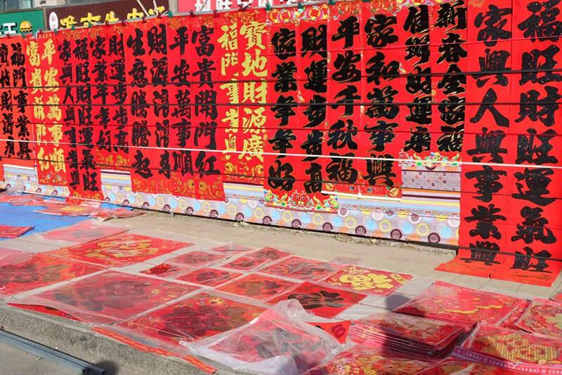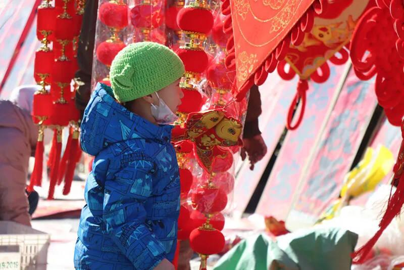 闪着金光的福字对联,喜庆!酸甜可口的冰糖葫芦,爽口!金黄酥脆的爆米花,满锅香!锅碗瓢盆、柴米油盐、鸡鸭鱼肉……你想要的一应俱全。