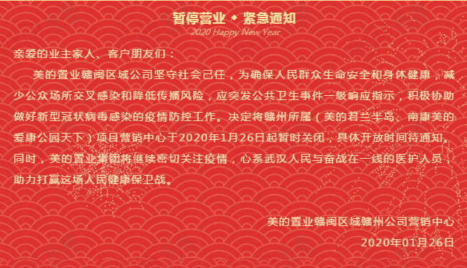 1月26日,美的置业赣闽区域赣州公司营销中心发布《关于美的置业赣闽区域美的君兰半岛、美的爱康公园天下项目春节期间暂停营业的通知》,即2020年1月26日起,将赣州所属(美的君兰半岛、南康美的爱康公园天下)项目营销中心暂时关闭,具体开放时间待通知。
