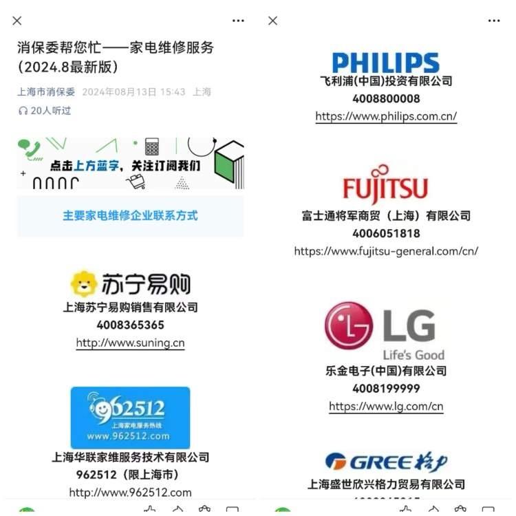 针对这一问题,上海各区消保委专门制作了实地暗访的短视频,并通过官方渠道进行发布。同时,上海市消保委还搜集了主要家电品牌的特约维修电话,制作了“消保委帮您找——家电维修信息表”。消费者可以通过上海市消保委的官方微信号和官网进行查询,以便找到正规的家电维修服务。