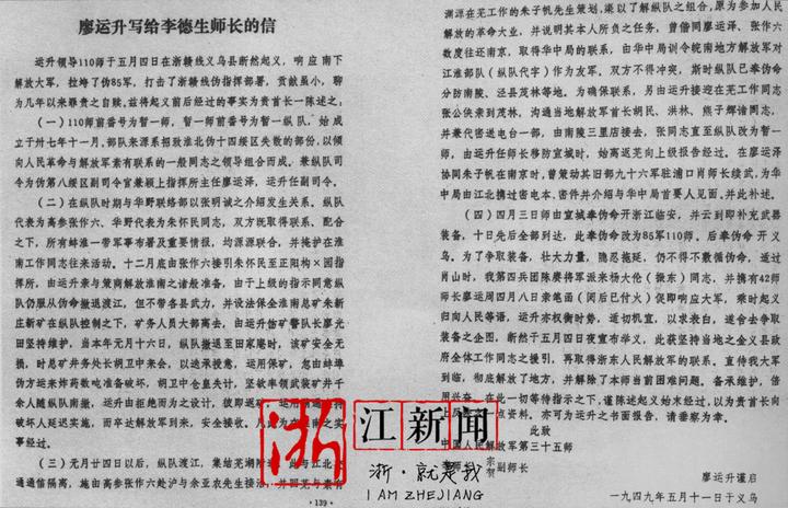 驻义乌国民党一一O师师长廖运升写给解放军十二军三十五师师长李德生的信