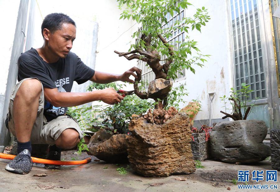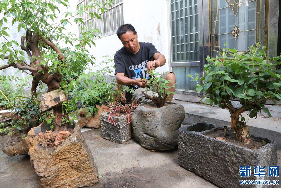 7月12日,河南省宝丰县杨庄镇石洼村青年温群生在修剪展示自己创作的奇石盆景作品。