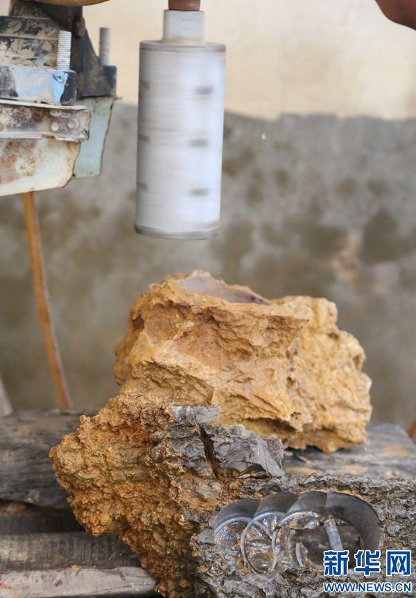 7月12日,河南省宝丰县杨庄镇石洼村青年温群生使用雕刻机加工奇石盆景作品。