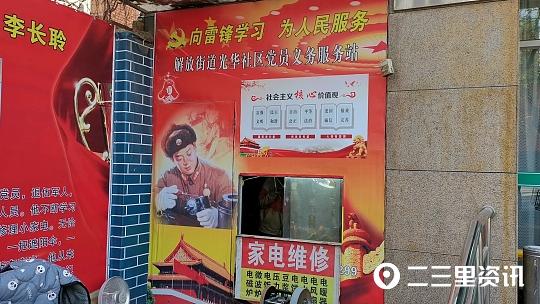 12月1日中午11时许,在修理部外墙的海报中,雷锋正拿着螺丝刀修理东西;从旁边的小窗看进去,李长聆正坐在桌前给市民修电器。