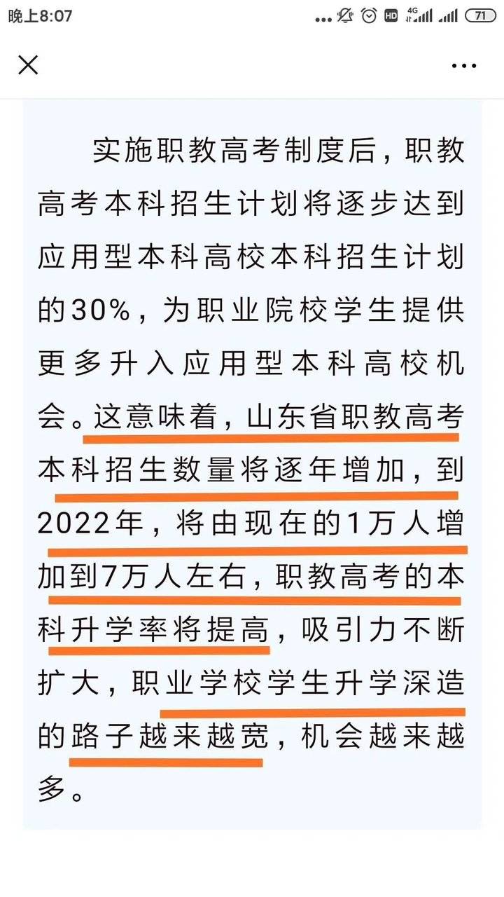 2020年1月,教育部和山东省联合发布《教育部山东省人民政府关于整省推进提质培优建设职业教育创新发展高地的意见》 政策福利一:到2022年本科招生计划将扩招7倍!福利二:从2022年起职教高考的学生将没有高中生竞争!福利三:职教高考打通了从中职一路到研究生的升学通道!福利四:到2022年职教高考优质本科大学将会越来越多!