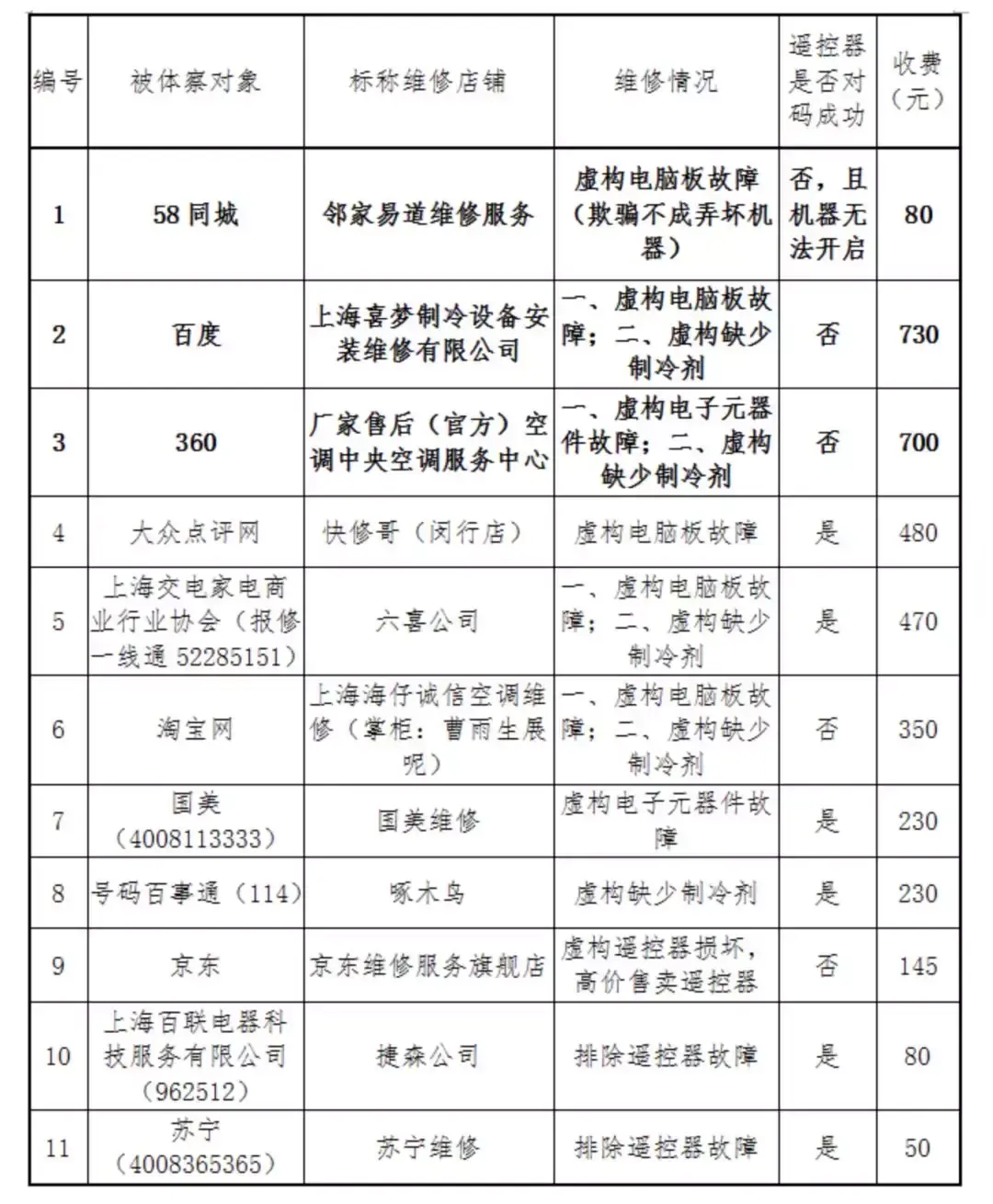 此外,大众点评网“家电快修哥”的维修工谎称空调电脑板损坏收费480元;上海交电家电商业行业协会平台企业的空调维修工谎称电脑主板坏、制冷剂不足是造成电脑主板坏的诱因,简单“修理”收费470元。淘宝网上的“上海海仔诚信空调维修”的维修工直接认定内机主板故障,简单“捣鼓”收费350元。国美、号码百事通(114)、京东等平台也存在相关问题,收取高额费用。
