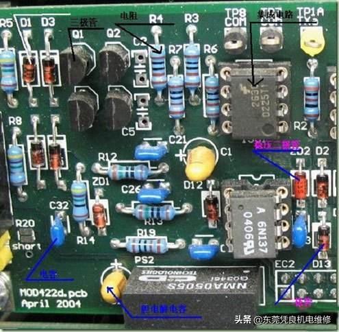 首先你要先认识电路板上的元器件都是些什么,在板子上是什么符号,例如电阻用R加编号来表示代表的是什么?这第一层次的简单,初步了解电阻(含可变)、电容(含电解)、晶体管(分二极管、三极管、发光管)、电感(变压器或陷波器)、集成化块、显示元件、电动元件、开关、电池及接地符号等即可,学会使用简单的电压、电流、电阻等测试仪表。细一点的话,应该知道电阻除了阻值之外,还有功率大小、碳膜、金属膜等分类,可变的有可变电阻、线绕电位器、碳膜电位器等。电容除了容量大小之分外,还有瓷片电容、涤纶电容、电解电容、无极性电容等。晶体管就更多了,仅二极管就有整流、检波、稳压、光敏等门类,发光的除了红光、蓝光、绿光、白光、双色、三色的之外,还有功率大小、指示、照明之分。集成块、显示元件这里略过,但说电动元件,可以想象的到家电中使用较多的电动机(洗衣机、吸排油烟机、换气扇、空调等)、自动控制继电器等。学会利用常见的维修工具,如万用表,滤波器、频率计、信号发生器等各种检查、检测、维修仪表和工具。当然最好是找一个好的老师带,老师教的再结合书上面写的,就能很快的掌握这方面的知识。