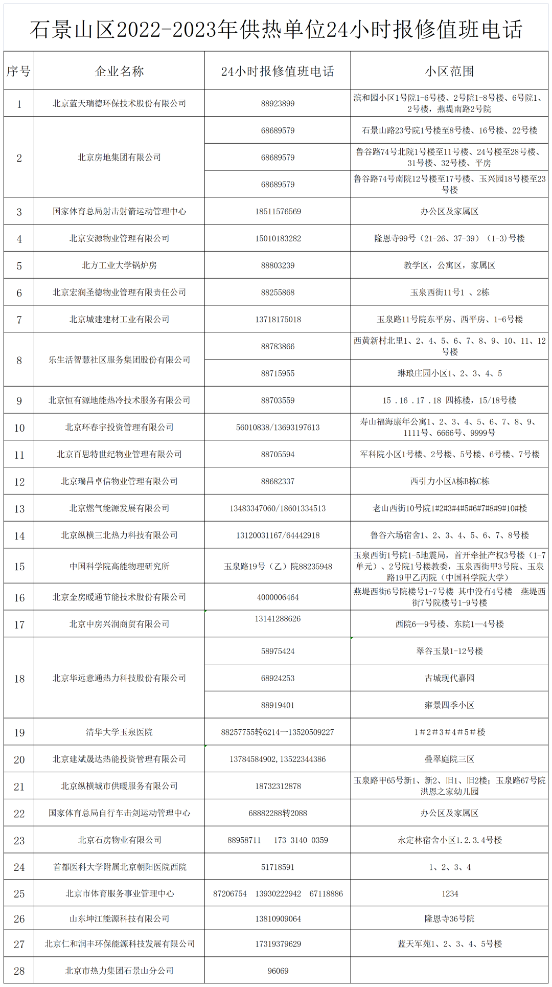 目前,全区有多家供热单位担负冬季居民供暖工作,京能集团所属北京热力石景山分公司(以下简称石景山分公司)承担石景山区超90%以上供热面积的供热服务工作。 石景山分公司在2022-2023年采暖季细化了各供热服务管家班的服务范围与精准对接街道融入社区的网格化,给属地居民提供更加便捷的供热服务,畅通报修服务渠道,及时响应用户诉求,快速处置相关问题。以下是北京热力石景山分公司在各街道服务站的联系电话。