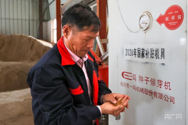 种粮大户余炎丰检查早稻催芽情况(央广网记者 俞烨 摄)