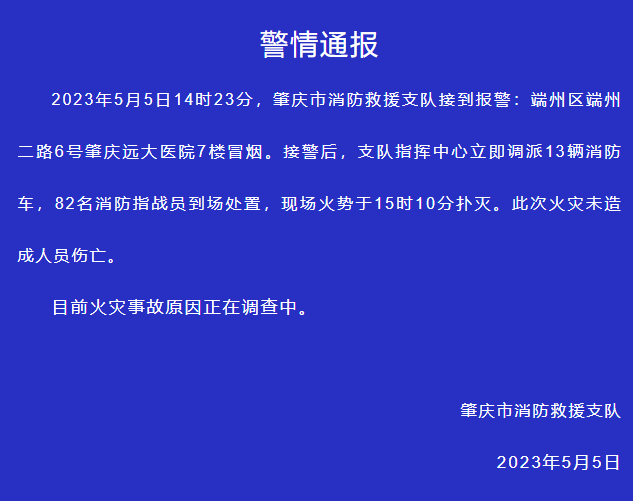 5月5日下午,肇庆消防发布警情通报称,5月5日14时23分,肇庆市消防救援支队接警:端州区端州二路6号肇庆远大医院7楼冒烟。现场火势于15时10分扑灭。此次火灾未造成人员伤亡。目前火灾事故原因正在调查中。