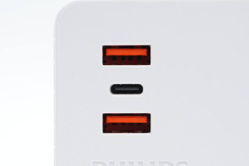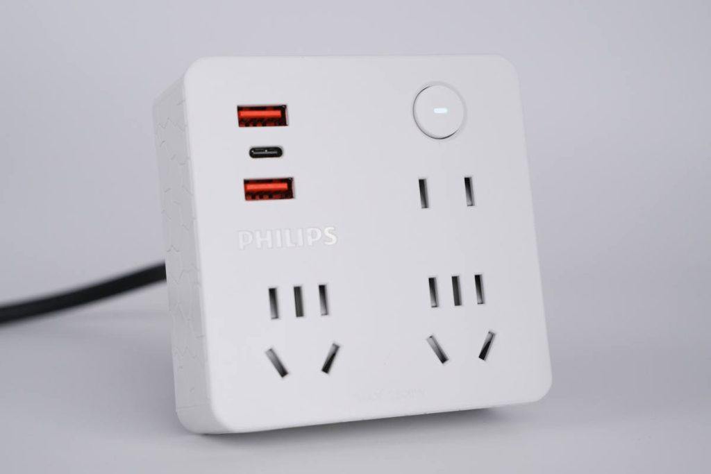 机身顶面设有二合一电源键、2A1C USB接口、一个双脚插孔以及两个3+2组合插孔,外壳上还设计有PHILIPS品牌。