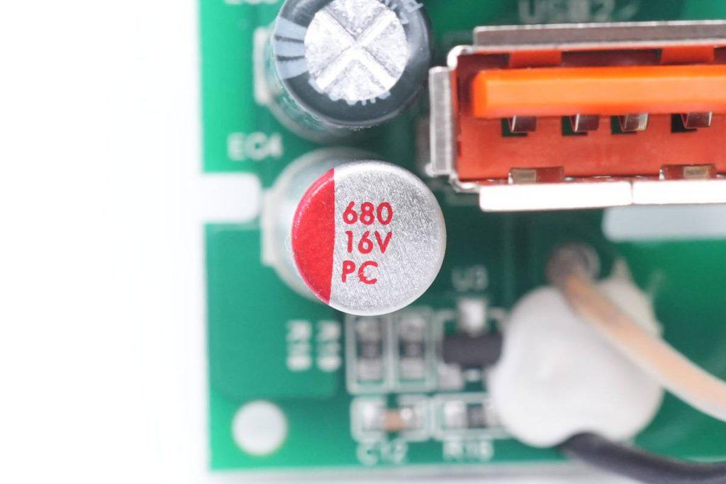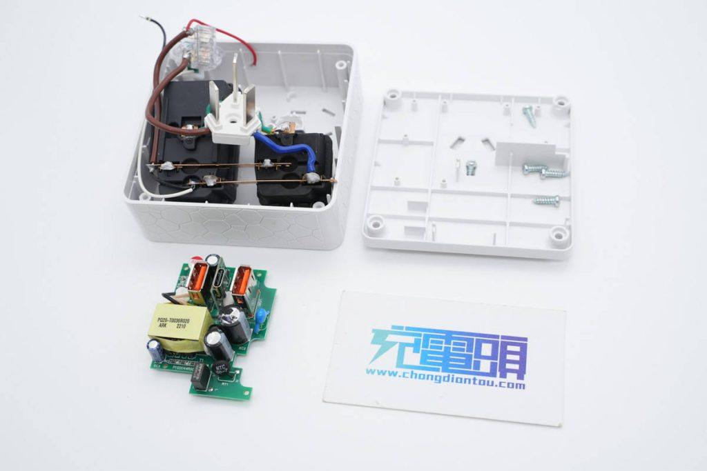 协议芯片部分来自天德钰,分别使用两颗协议芯片对应USB-C和USB-A接口,支持单口快充输出,多口同时输出时将为5V。插座外壳内部开有隔离板,对应插入PCB板的开槽中,加强绝缘,整体做工安全可靠。