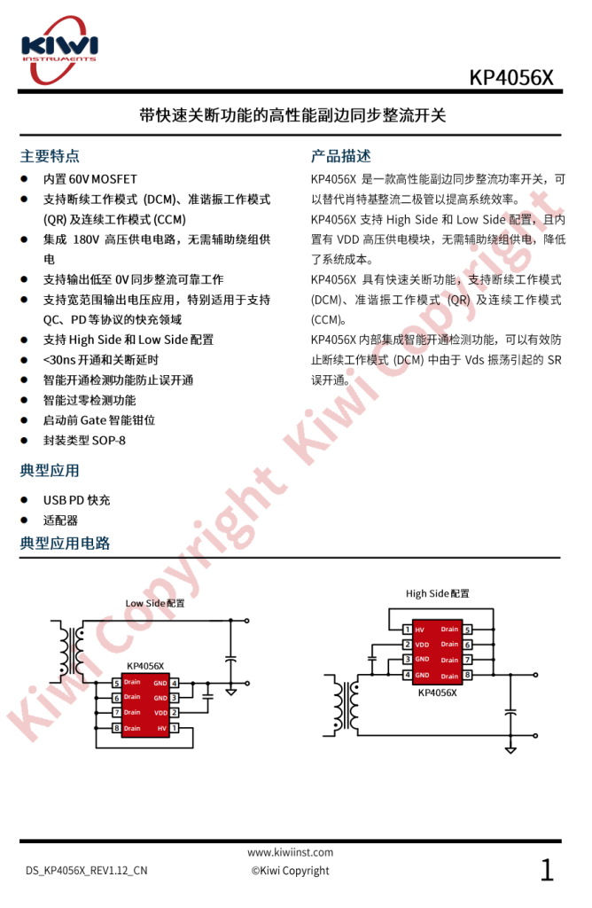 KP40511内置60V MOSFET,还集成智能开通检测功能,可以有效防止断续工作模式(DCM)中由于Vds振荡引起的SR误开通。