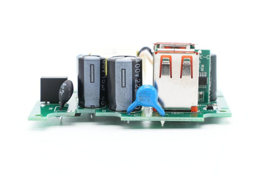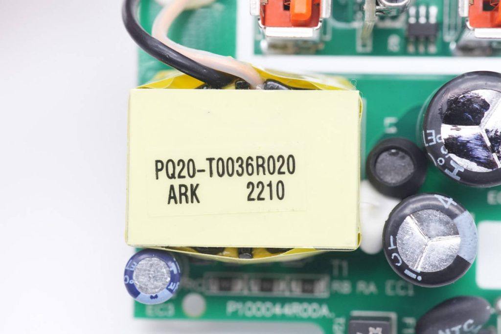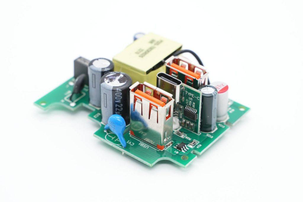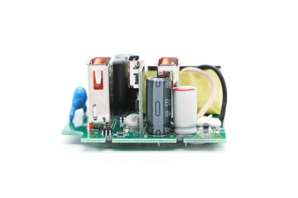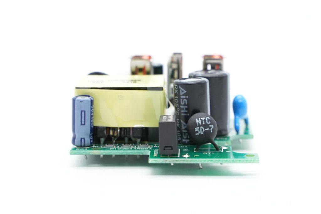 快充模块PCBA正面一览,左侧为USB输出接口和滤波电容,右侧上方是高压滤波电容,NTC热敏电阻和保险丝,右下角是变压器。