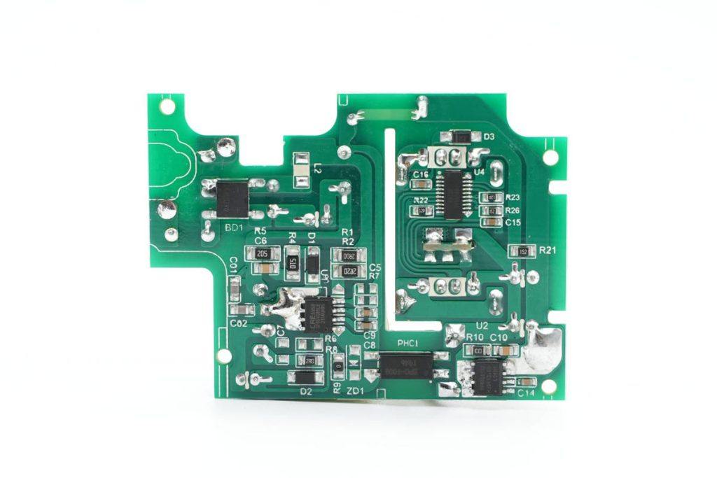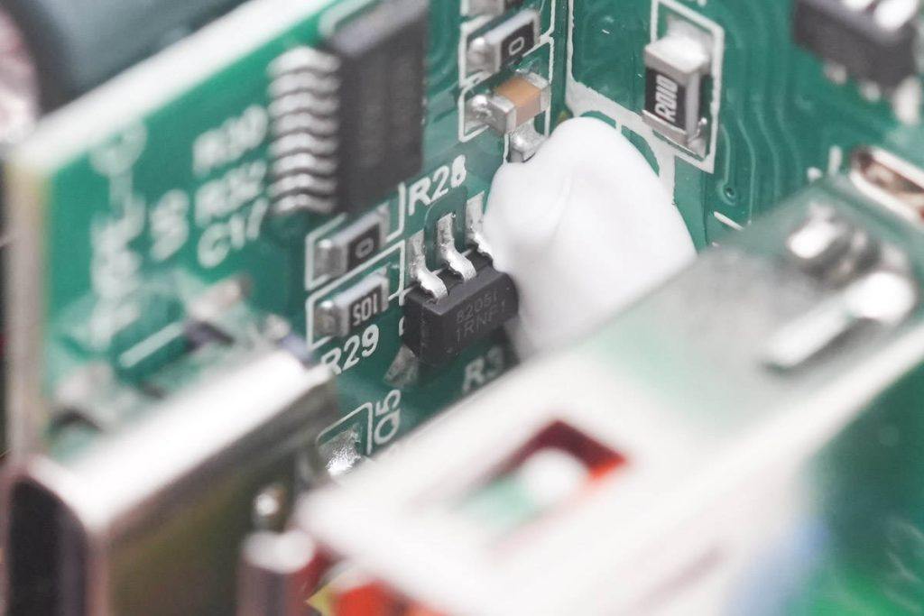 快充模块PCBA背面一览,左上角为整流桥,下方为初级电源芯片,右侧为协议芯片和同步整流芯片,初次级通过一颗光耦反馈输出电压。