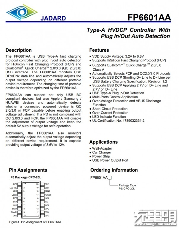 另外一颗协议IC同样来自天德钰,型号FP6601AA。这是一颗双USB-A口协议芯片,支持QC2.0/3.0,华为FCP快充协议,并支持多路协同工作,实现单口快充,多口5V输出。