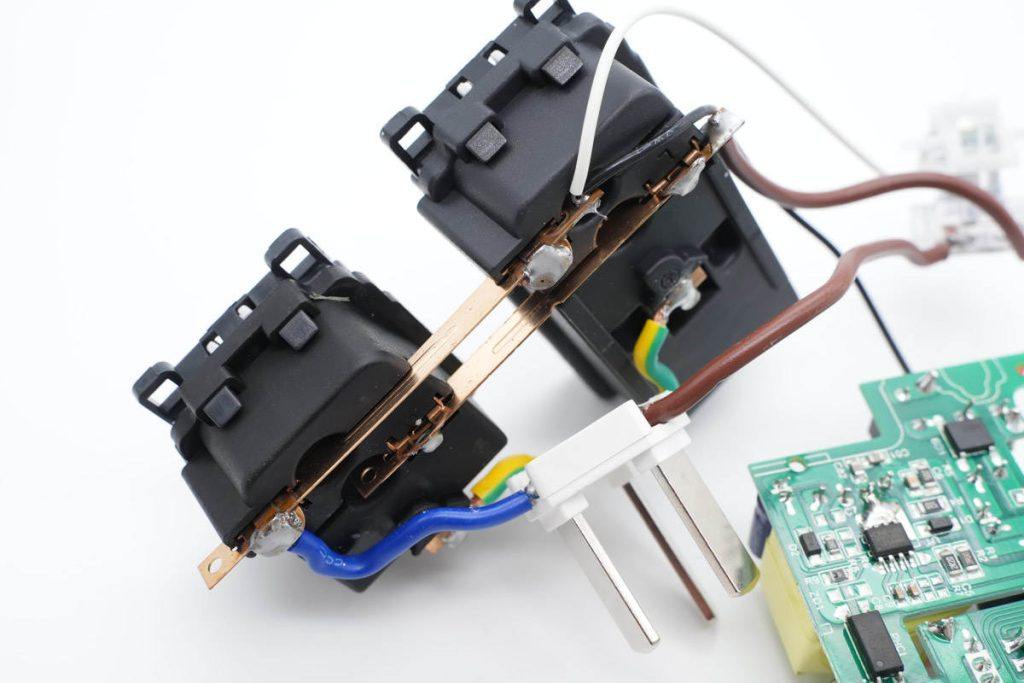 插座内部采用导线焊接连接,棕色线为火线,零线为蓝色,地线为黄绿色。其中火线连接到开关,零线铜带焊接白色和黑色导线,分别为指示灯和快充模块供电。插座模块使用铜带焊接连接,并通过螺丝固定的插头进行固定。