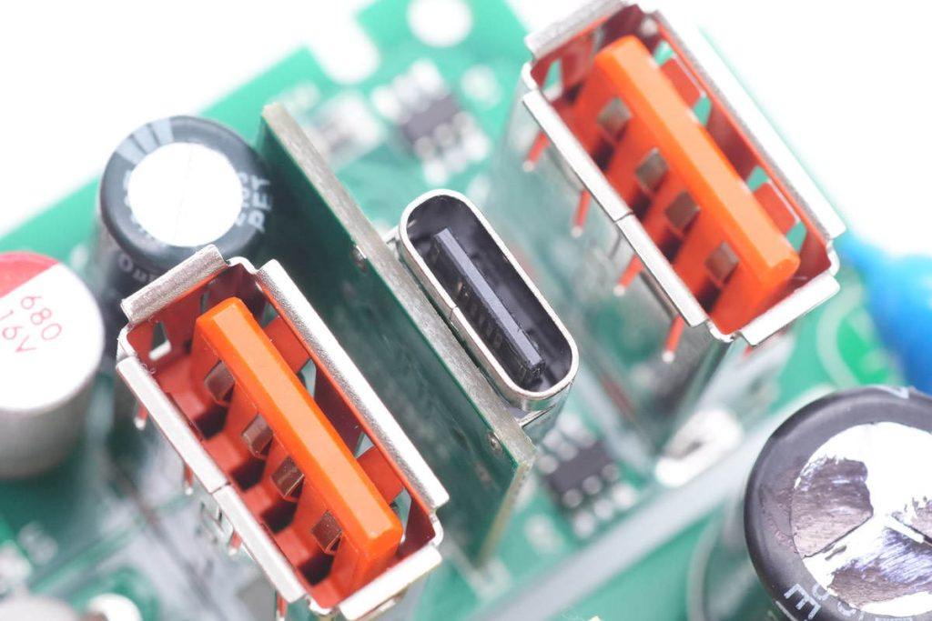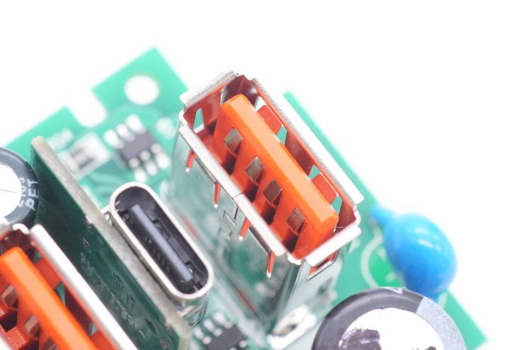 输出端垂直焊接两个USB-A母座,USB-C母座焊接在垂直小板上。