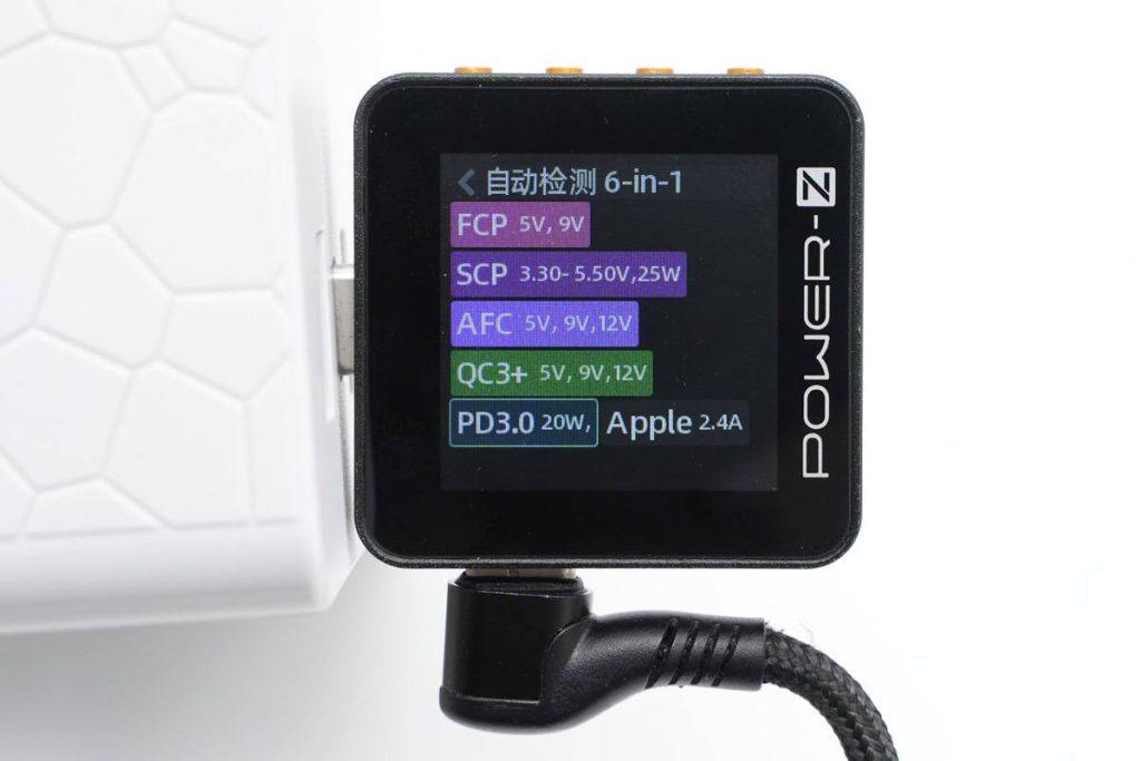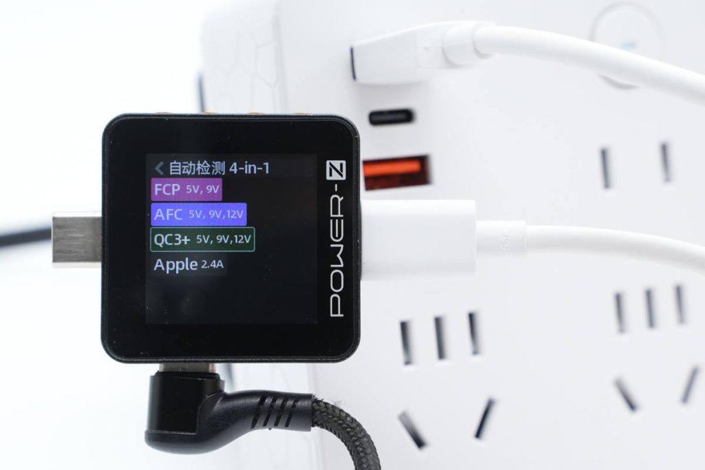 使用ChargerLAB POWER-Z KM002C测得USB-C口支持FCP、SCP、AFC、QC3.0、PD3.0、Apple2.4A协议。