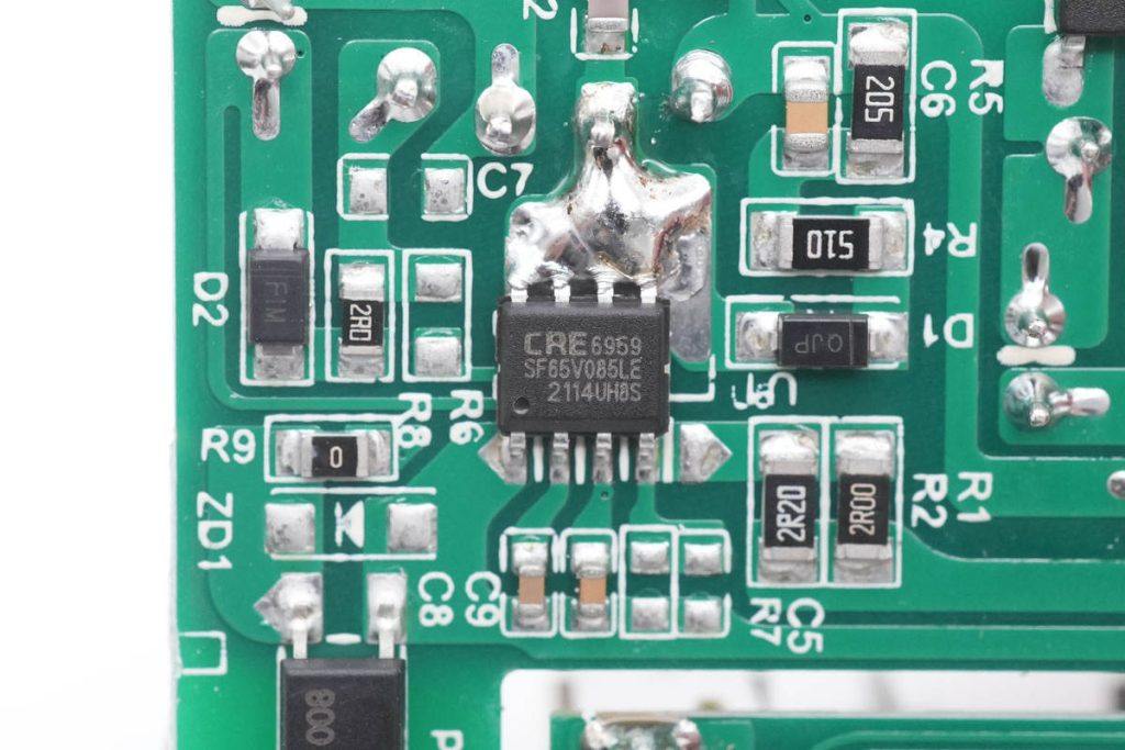 初级主控芯片来自康源半导体,为CRE6959系列,芯片内置CoolMOS,待机功耗低于75mW,支持20W功率,内置过热保护和过流保护,采用SOP-8封装。