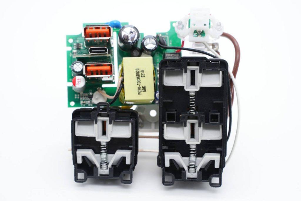 取出插座内部的快充模块和插座模块,插座模块均有安全门,防止异物进入,外壳内部还开有隔离板,插入快充模块的初次级开槽内绝缘。