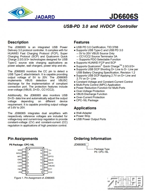 USB PD协议芯片采用天德钰JD6606S。通过了USB PD 3.0认证TID:3768。这是一颗高性能和高兼容性的快充协议芯片,采用CPC-16L封装,支持USB PD3.0快充之外,还包括支持QC3+、QC3.0、QC2.0、AFC、FCP、SCP以及APPLE 2.4A等主流的充电协议。