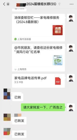 线上宣传:各村居干部线上转发《家电维修“清风行动”红名单》等信息供居民查看,引导社区居民通过正确渠道获取家电维修服务信息,提高居民对正规家电维修服务的认知。