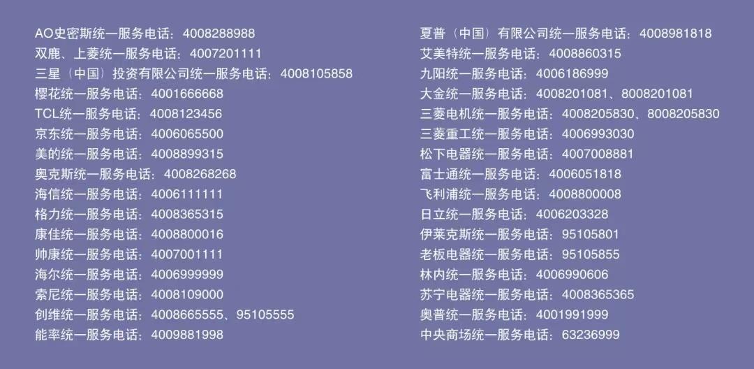 各大家电厂商维修服务电话