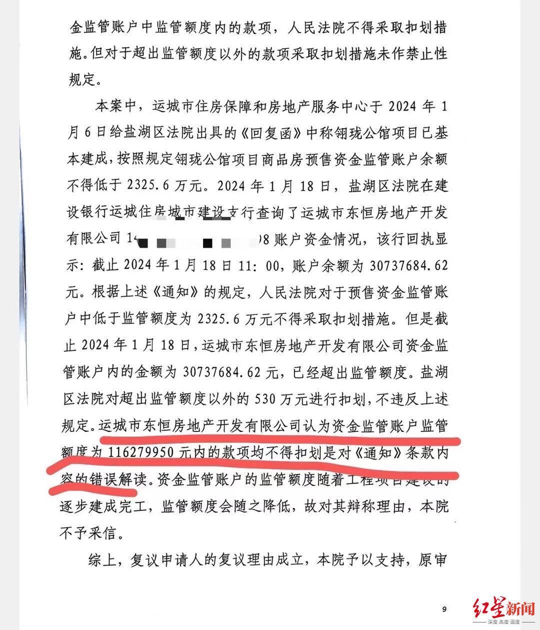 弓瑞东向红星新闻提供的一份运城中院于今年5月20日作出的《执行裁定书》中显示,翎珑公馆项目已基本建成,按规定该项目商品房预售资金监管账户余额不得低于2325.6万元。截至今年1月18日,该监管账户余额仍有超3000万元。运城中院认为,因《通知》未对超出监管额度以外的款项采取扣划措施作禁止性规定,故盐湖区人民法院对超出监管额度以外的530万元进行扣划并不违反《通知》规定。