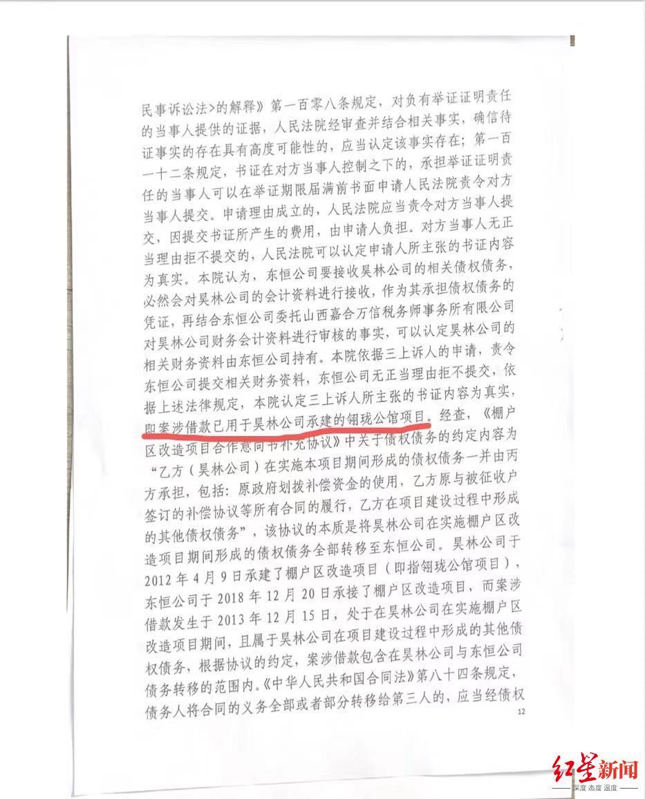 对此,运城中院在二审判决书中指出,关于案涉借款是否用于昊林公司承建的翎珑公馆项目,通过查询昊林公司相关财务资料即可查明。二审中,上诉人称案涉借款系用于昊林公司承建的翎珑公馆项目,并举证证明昊林公司相关会计资料由东恒公司持有,东恒公司均予以否认。法院认为,东恒公司要接收昊林公司的相关债权债务,必然会对昊林公司的会计资料进行接收,作为其承担债权债务的凭证,再结合东恒公司委托山西嘉合万信税务师事务所有限公司对昊林公司财务会计资料进行审核的事实,可以认定昊林公司的相关财务资料由东恒公司持有。法院依据三上诉人的申请,责令东恒公司提交相关财务资料,东恒公司无正当理由拒不提交,依据有关法律规定,法院认定三上诉人所主张的书证内容为真实,即案涉借款已用于昊林公司承建的翎珑公馆项目。