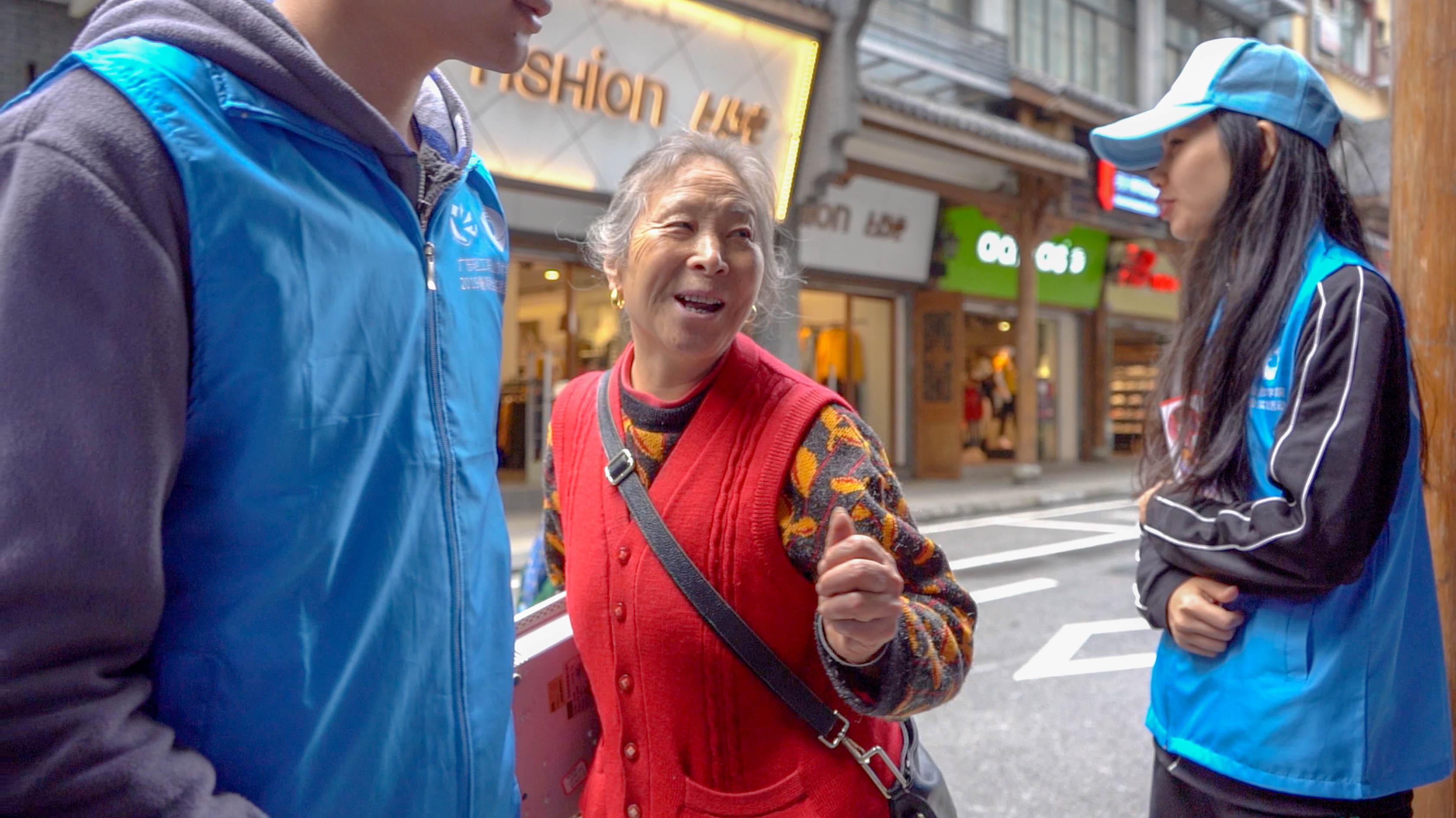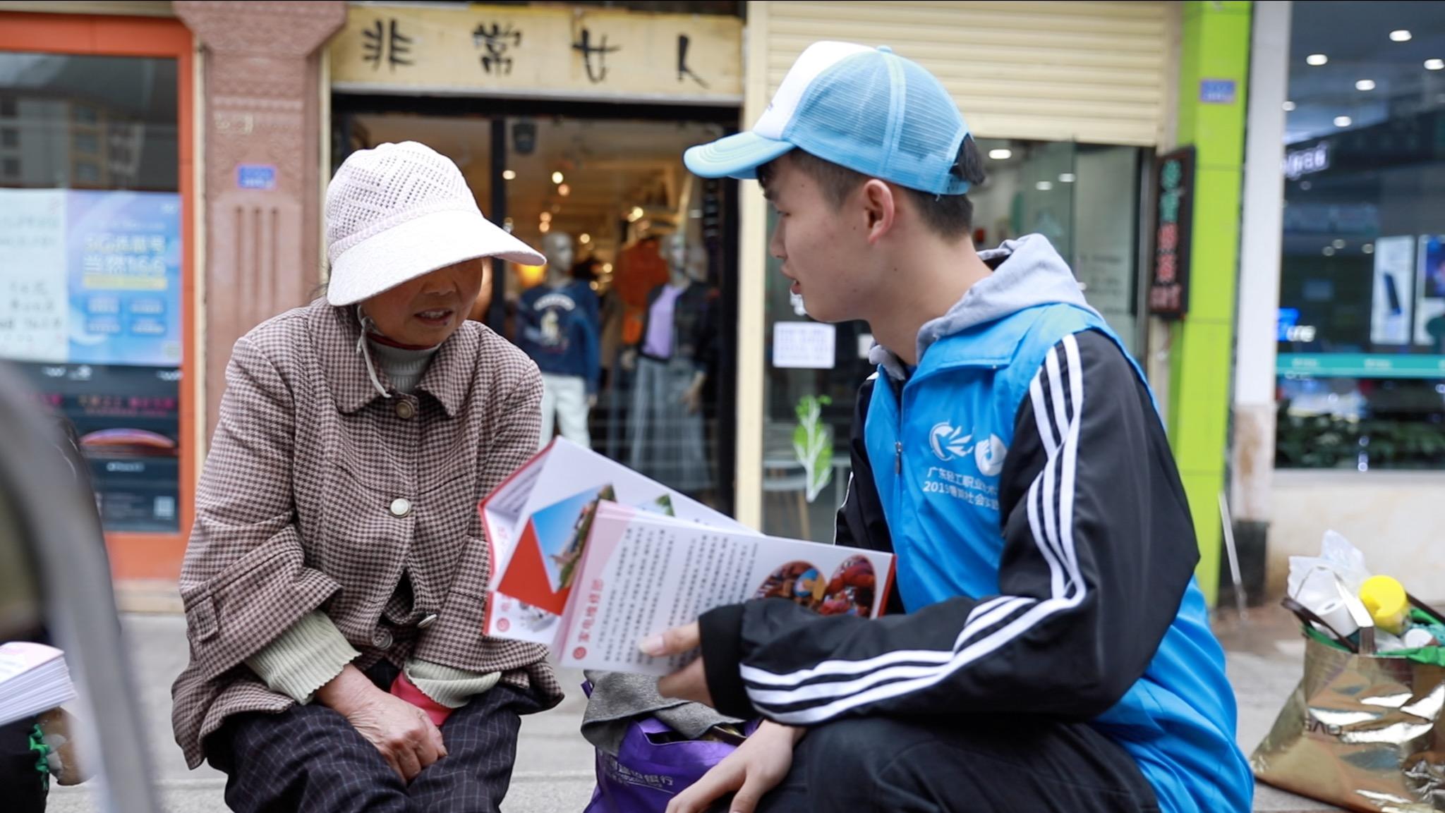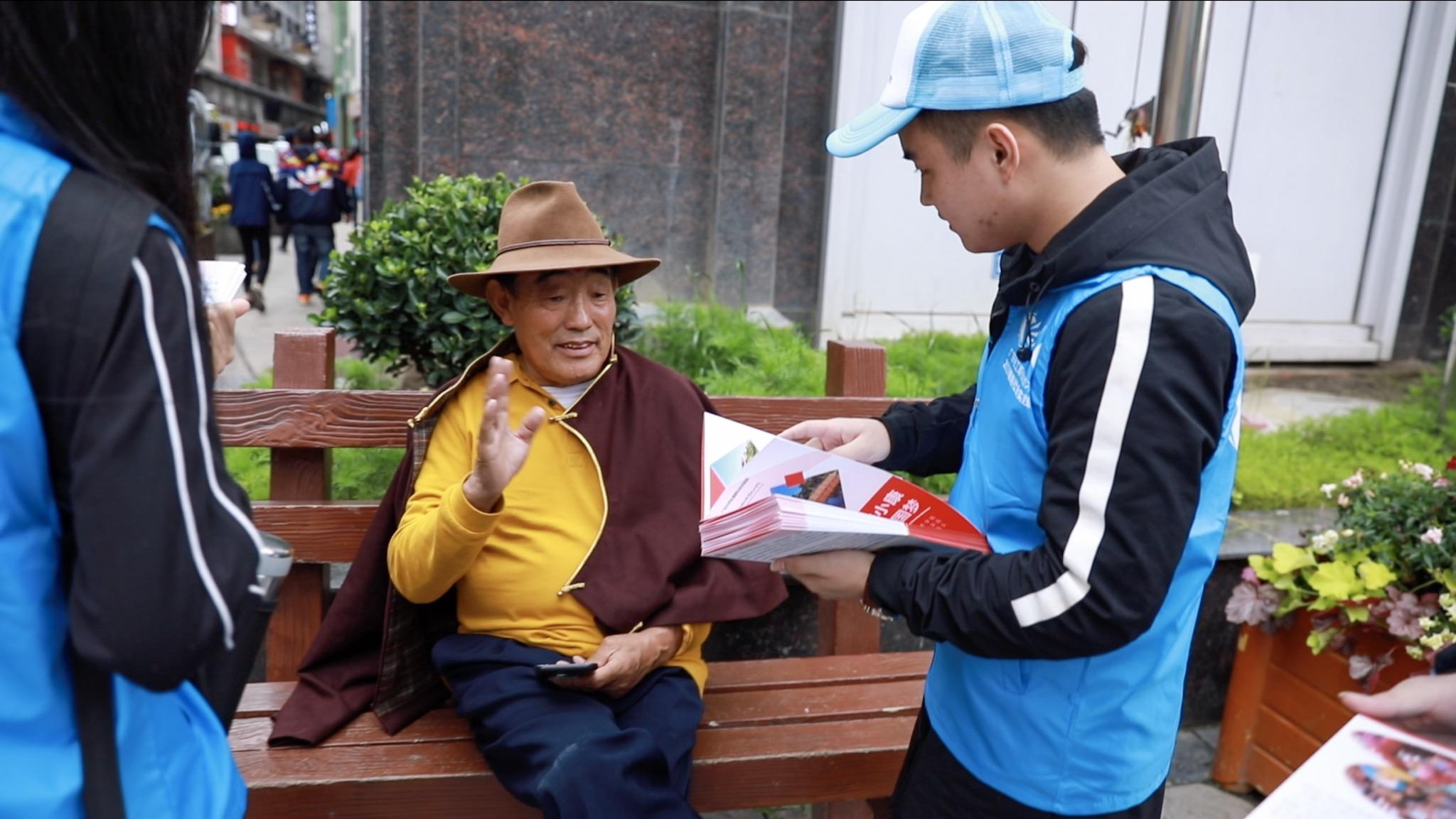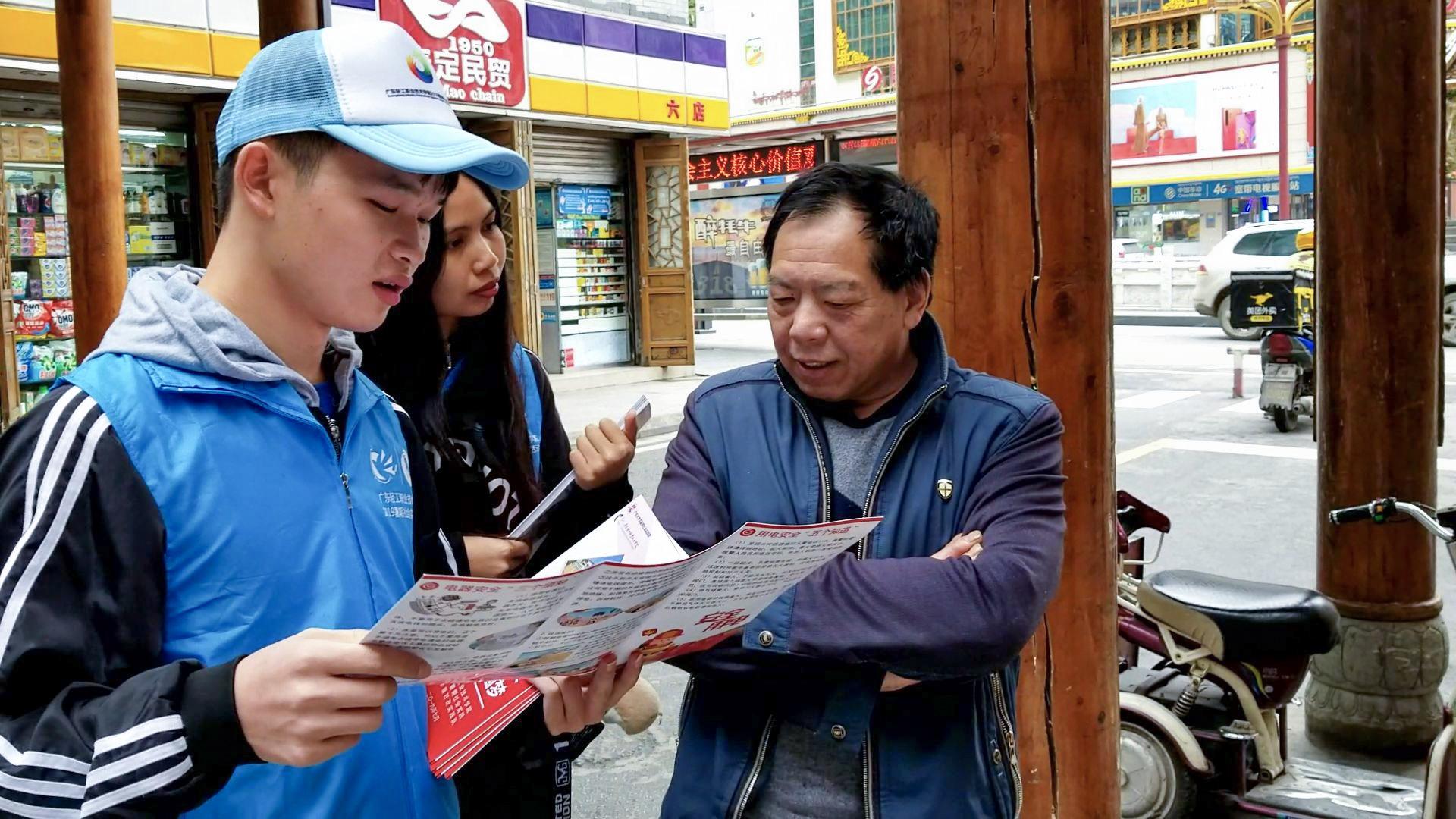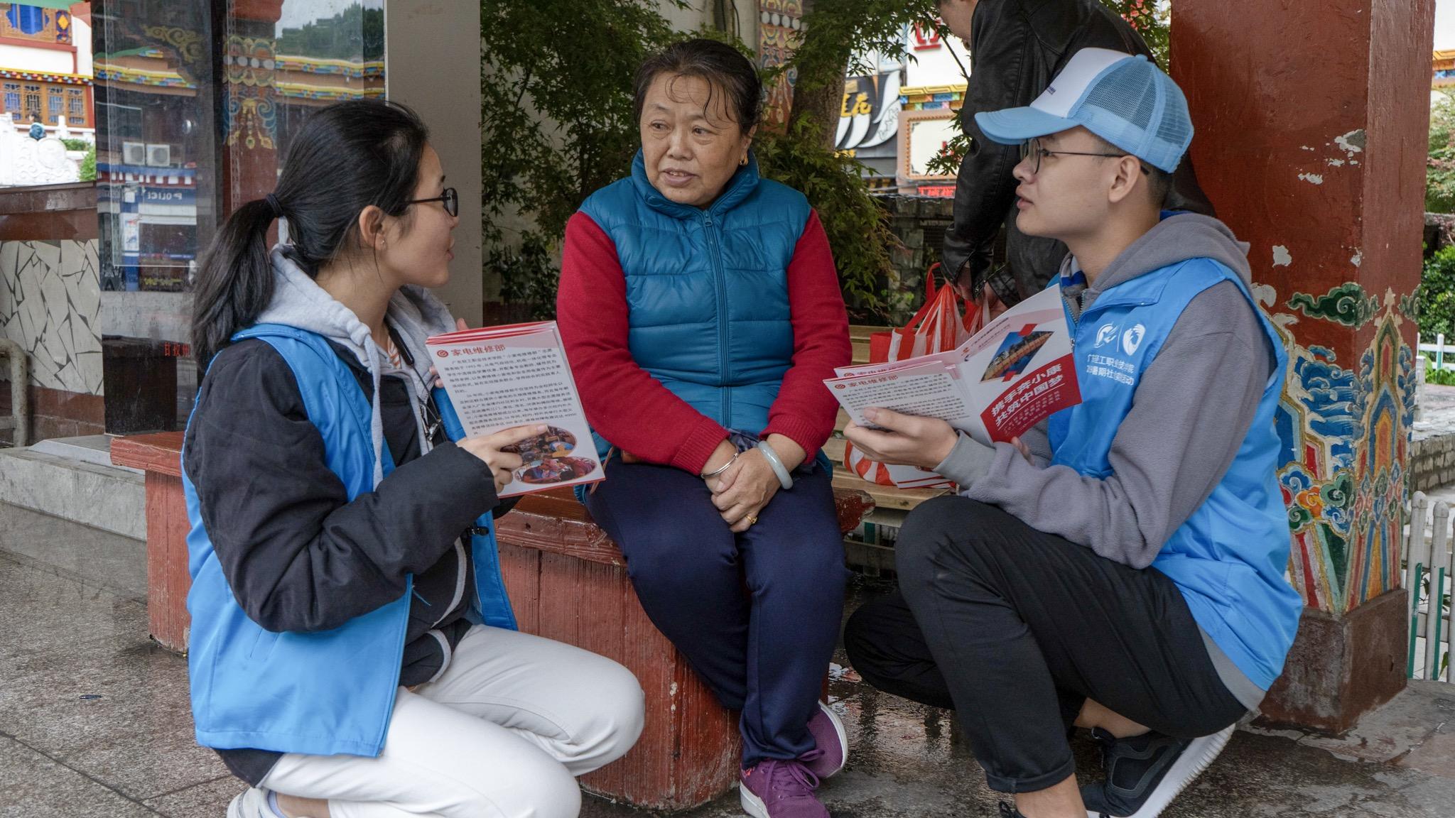 幸福甘孜实践队成员带着宣传册,为当地居民普及安全用电常识,同时宣传在康定情歌广场设置的家电维修站点 (屈铭添 摄)