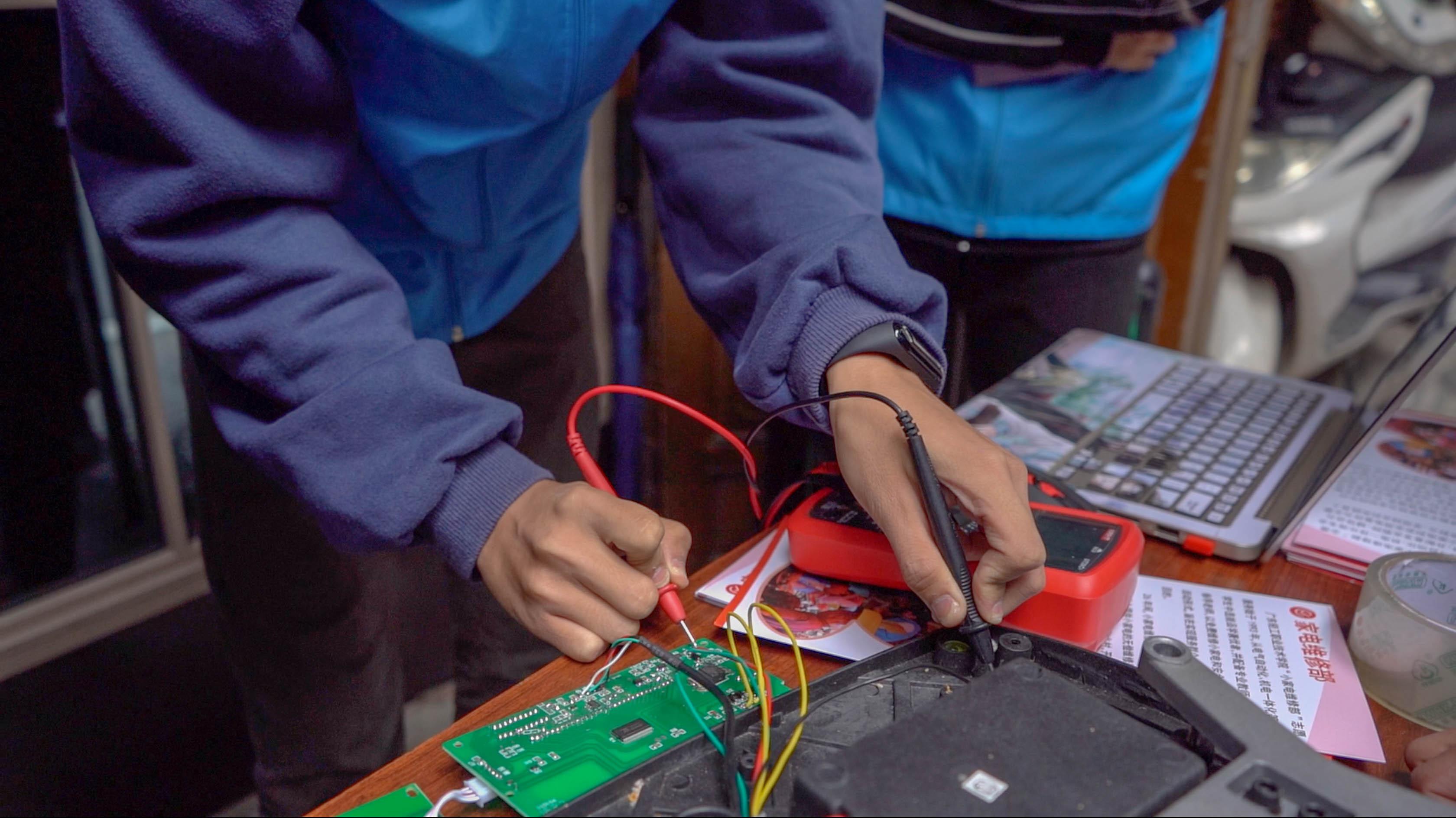 康定情歌广场服务站点上,幸福甘孜实践队成员利用在学校中习得的专业技能,为“休眠”家电进行诊断维修 (屈铭添 摄)