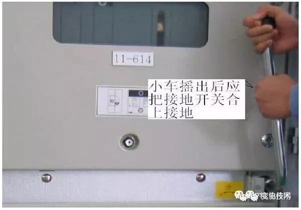 5、将接地开关操作手柄插入中门右下侧六角孔内,顺时针旋转,使接地开关处于合闸位置,确定接地开关确已合闸后,打开柜下门,维修人员方可进入维修,检修。