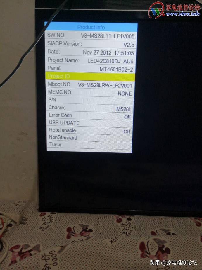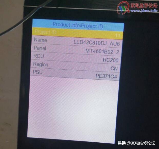 接客户电话说一台乐华液晶电视LED42C830S指示灯亮不开机,问其原因说放置4、5天后在开机指示灯亮不开机,按压遥控、按键均不起作用,拆吧,真是没的说现在的液晶电视螺丝真的多啊,拆完量基本电压,上电量的电源板输出3.3v、3.3v 、24v 。怎么开机就给信号呢。怀疑主板坏,接着查资料,网上说这个品牌的引导爱坏,本着先软后硬的原则,找吧找啊网上就一家卖引导的,我去,没办法卖吧,店家直接给扔了个软件,让编程器写,没有啊,让店家直接写好,邮回来,等了3天回来了,满心欢喜的装上以为能好,谁知装上还是一样,联系店家说看看打印信息,没有编程器啊,算了买一个反正要经常用了,在本论坛淘宝店卖了一个,回来插上一看打印信息ddr坏,算了直接网上淘主板,店家要了屏型号,板子型号。OK。坐等主板回来,又等了3天板子回来了,这次总该好了吧,装好板子检查插接件全部插好,上电开机,画面终于出来了,咦怎么是倒屏啊,记得以前调过倒屏,随机咨询卖家要到工厂密码(菜单调到对比度,9705或者9735,进工厂选择project ld.)第一项切换,把11改为6改好后按遥控的OK 或者确认健保存设置然后遥控关机重启。重启 后电视开始花瓶了,心都凉半截了,店家说再调,我去花瓶的字符都看不清,怎么调,店家没办法直接扔了个引导,跟强刷,说先强刷,在写引导,好吧据需做吧。做完强刷写完引导直接变成TCL的开机画面了,联系店家店家说进工厂(TCL机芯电视屏参调试步骤: