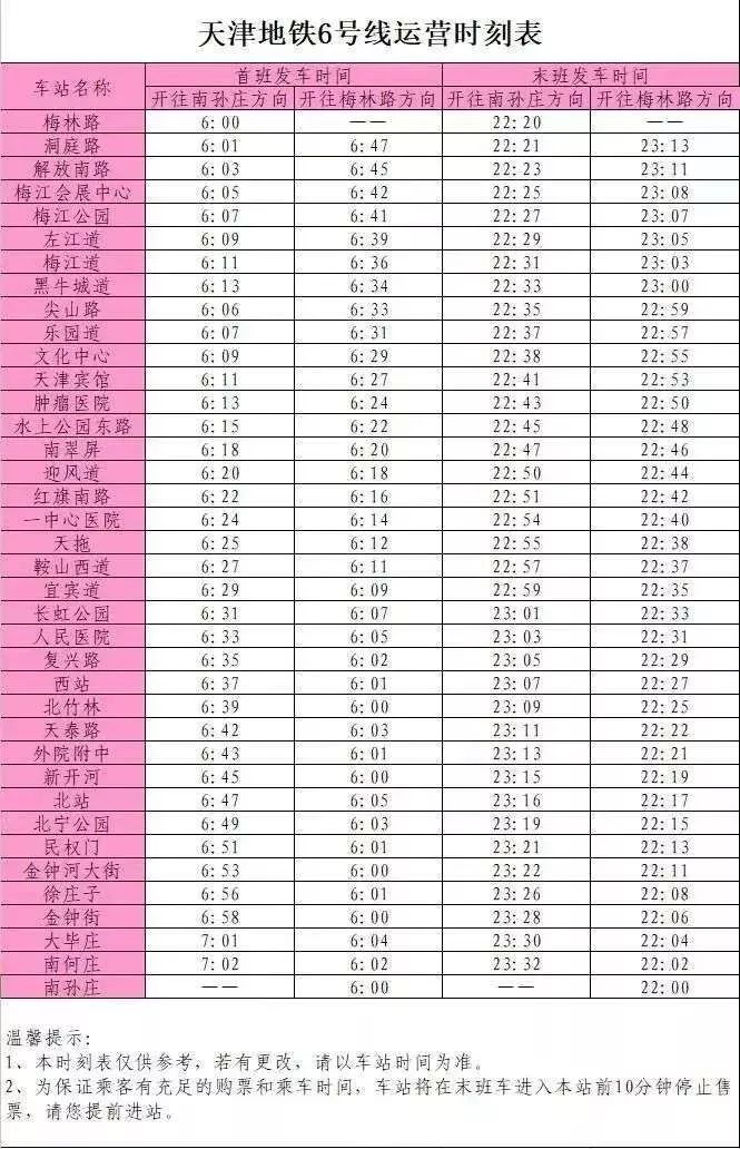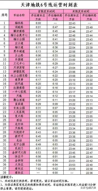 天津地铁线首末班车时刻表及运行间隔一览