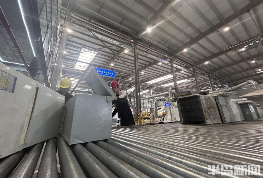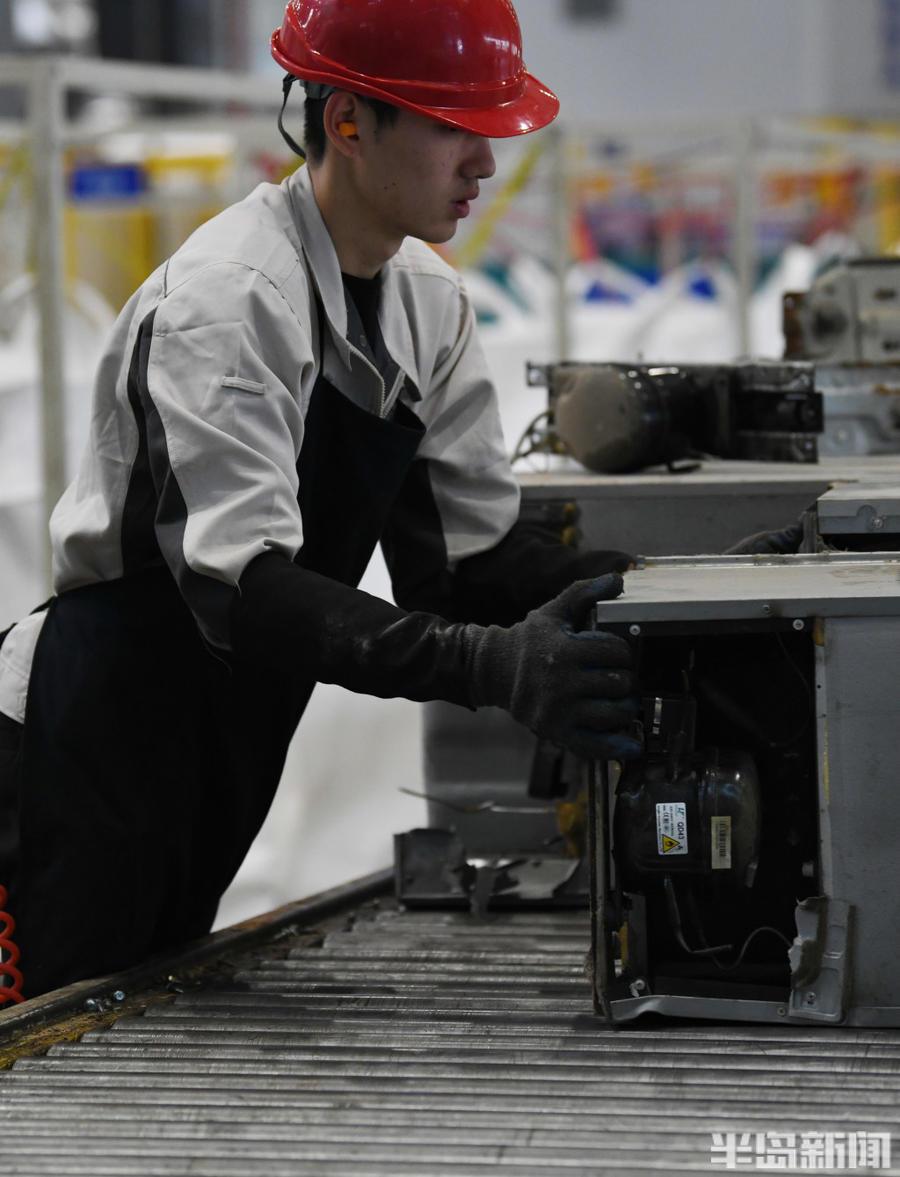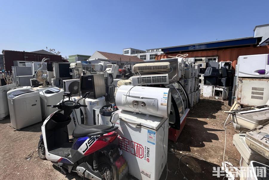 4月25日,一些回收的废旧家电被分类存放在占地150亩的青岛海绿源公司,分解车间内机器轰鸣,头戴安全帽的工人正在各自岗位上劳作。