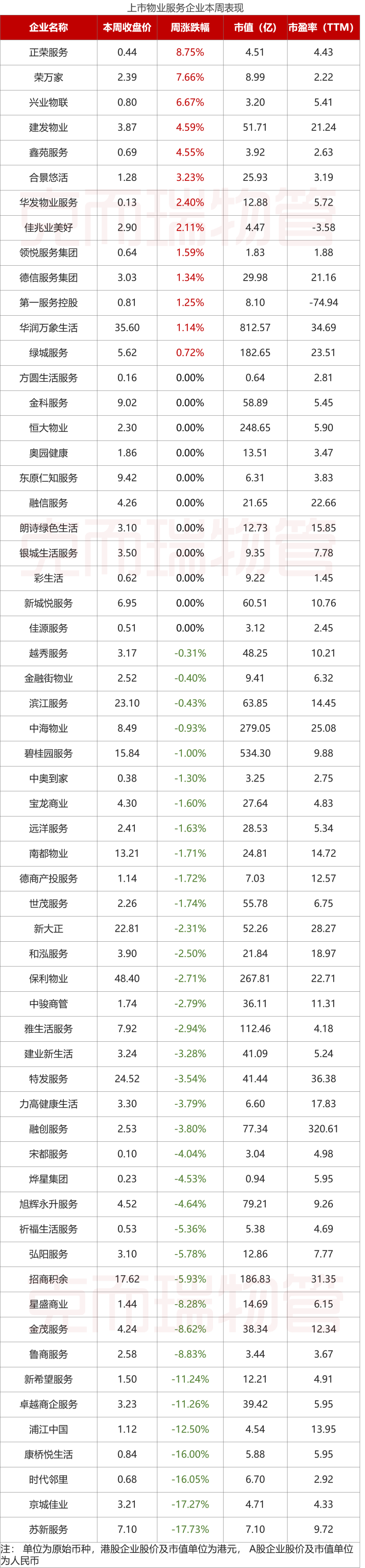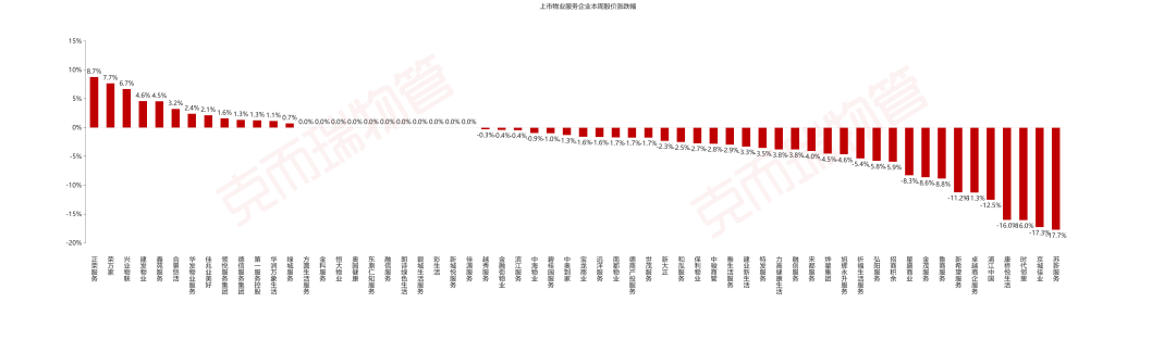 本周物业管理板块整体平均涨幅-1.78%,已上市60家企业中13家股价上涨,占21.67%,其中正荣服务最高,为8.75%。