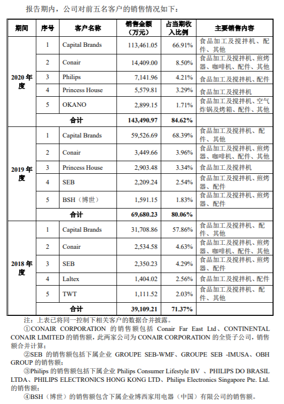 其中,报告期内,博菱电器对第一大客户Capital Brands的销售收入分别为3.17亿元、5.95亿元和11.35亿元,占营业收入的比例分别为57.86%、68.39%、66.91%,均超过50%,对第一大客户存在严重依赖现象。