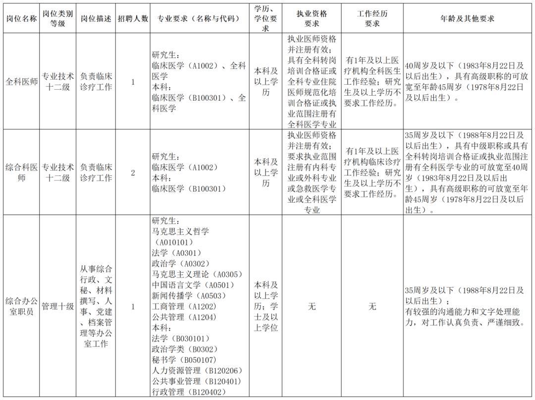 全科医师1名、综合科医师2名、综合办公室职员1名