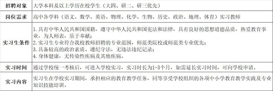 提供免费住宿;为实习生配备优秀指导老师,让其走进课堂、跟班学习;实习期满,学校将为实习生提供实习证明。