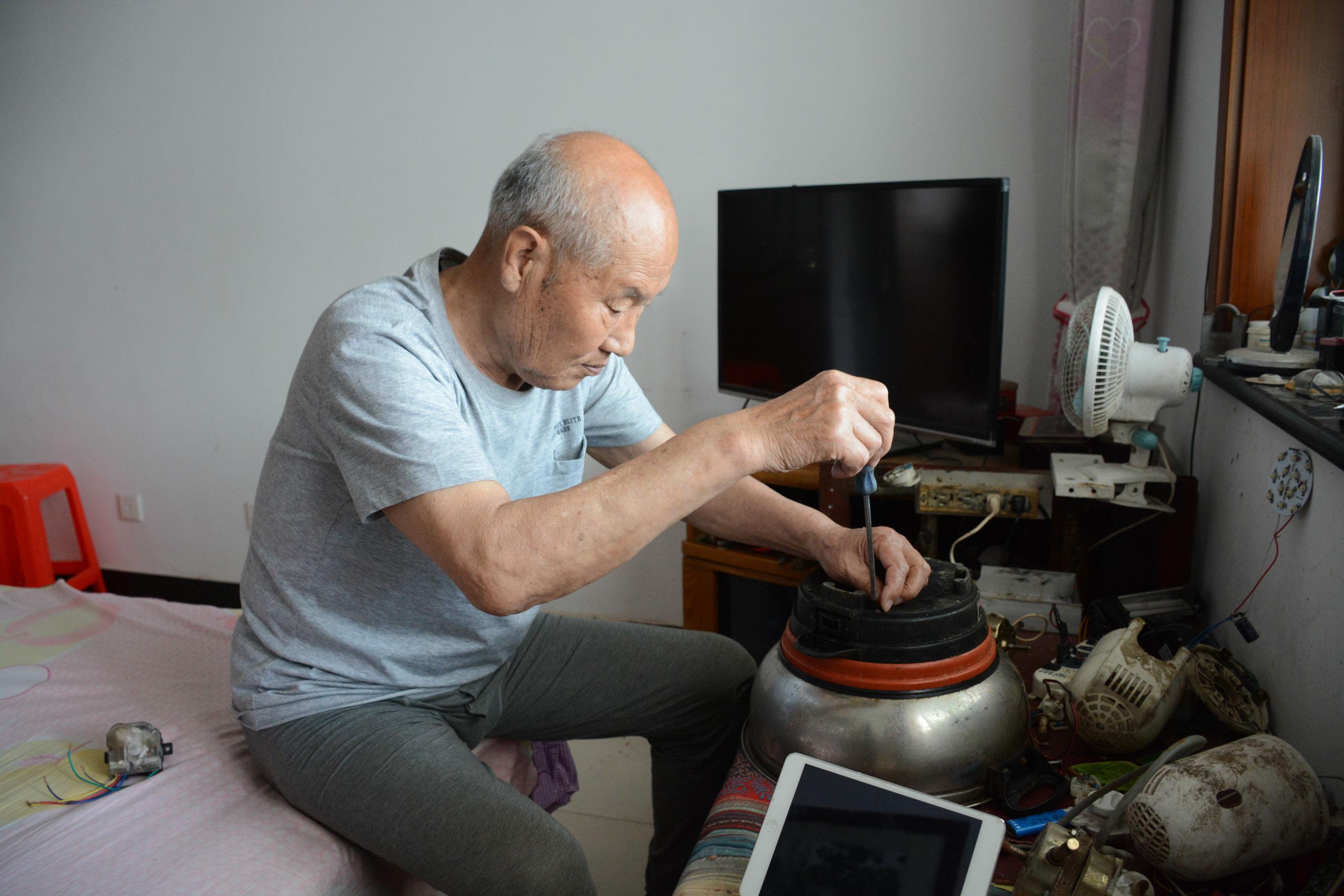 2016年春天,退休在家的张鹤涛发现自家用的一把电热水壶坏了。“我把它拆开,看看到底哪坏了,原来是壶壳部位坏了。我就去一个收破烂的摊上找了一个旧壳换上,壶又能用了。”修理成功的喜悦和成就感,让他一发不可收。于是,小区内外,张鹤涛老人逢人便问“你家有用坏的家用电器吗?”