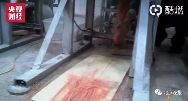 在平江县的另一个厂房里,记者看到一名工人顺手抓起落在地上的面筋丝,放到了机器里,整个过程中,面筋不断在地上拖动……