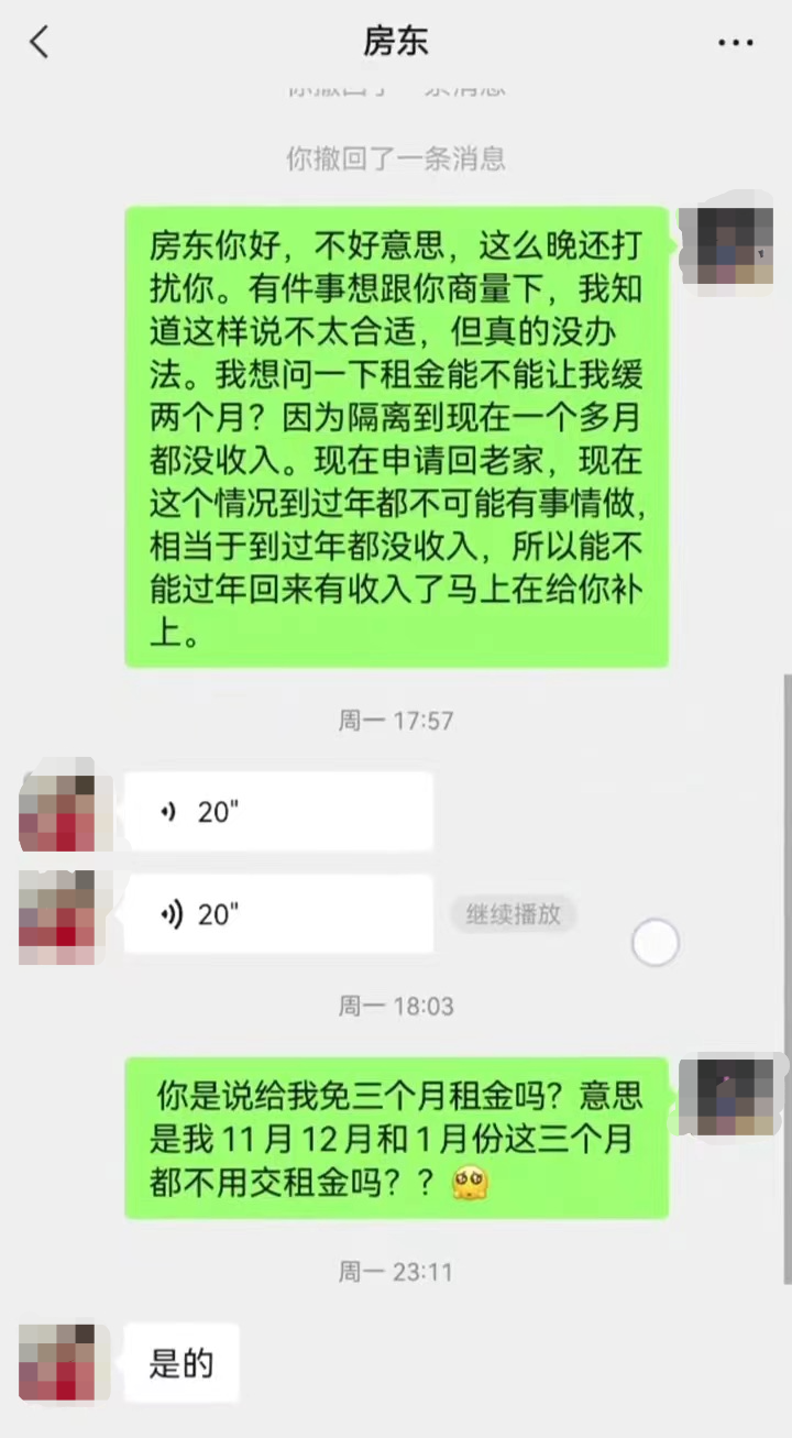 根据胡先生发布的聊天记录,11月28日,他通过微信对房东戴女士表示,因过去这段时间受疫情影响,已经一个多月没有收入,正准备回老家,并询问能否延缓支付两个月的房租,等过完年回到广州再补上。戴女士在微信中语音回复,“我知道你们也挺难的,也帮不到你什么,就免三个月租吧。不管怎样,相信明年会好起来的,所以一切就等明年回来再说吧,你也不要有什么压力。”