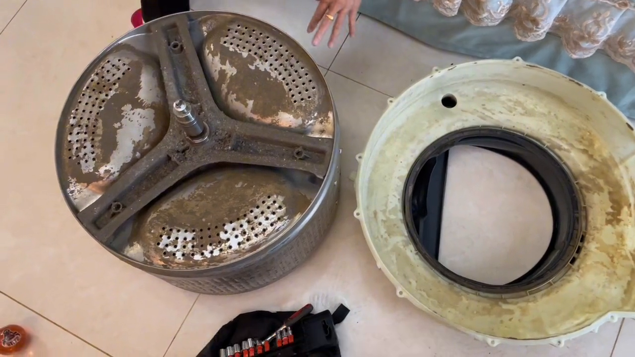 所以洗衣机如果需要清洗,千万不要花这种冤枉钱去做免拆清洗。如果这样的滚筒洗衣机不去做全拆,还不如用泡腾片直接泡洗一下,还省了100块钱。全拆就是把所有的能拆开的东西全部分解开来。全拆之后可以看到三脚架的部位是有多厚的一层污垢。如果这样的洗衣机不做全拆,不相信做免拆就能把它洗干净。