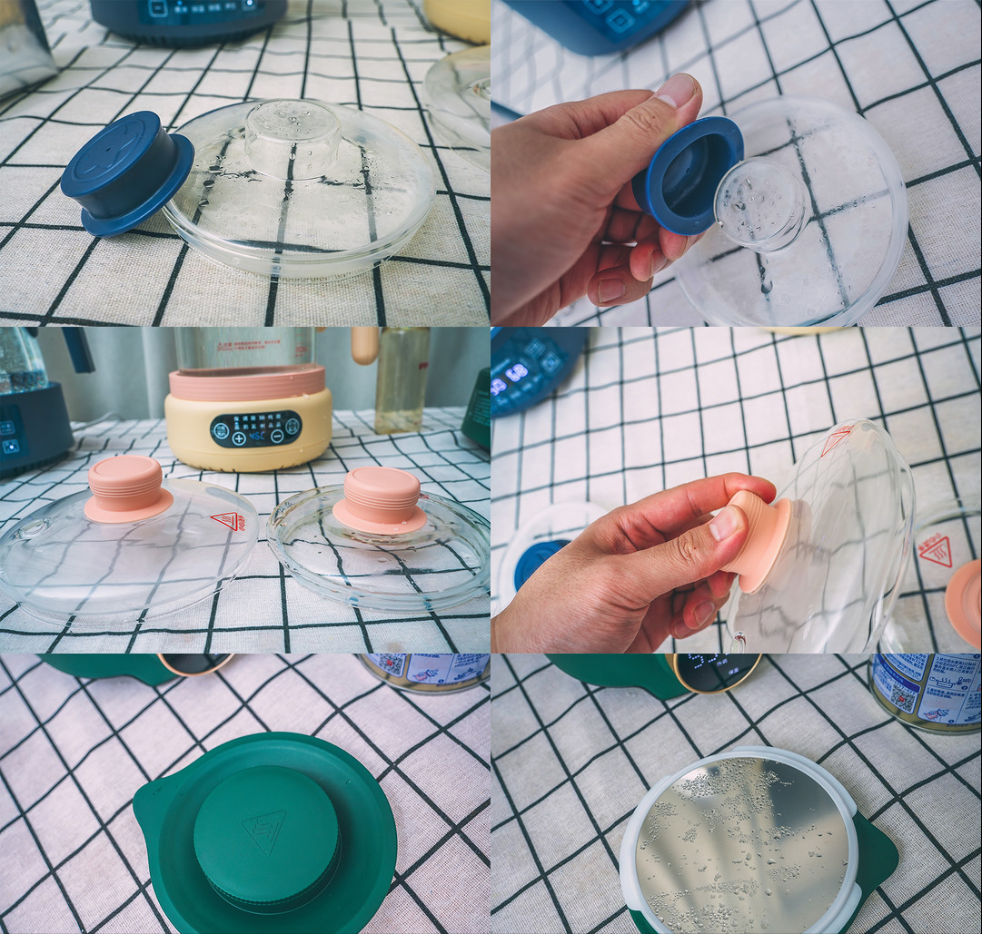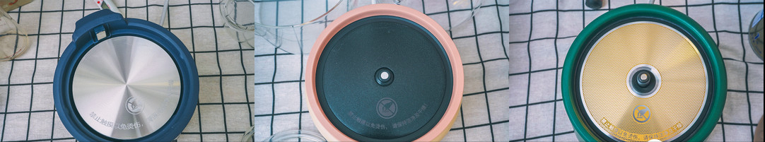 上盖设计方面,西屋是在玻璃上盖增加了一个胶皮。上方胶皮的安装位置是直上直下的设计,很容易就可以取下胶皮。热胀时候胶皮就软了,比较容易松动。七彩叮当的玻璃盖与西屋是类似的设计,只不过是上宽下窄的设计,两只手用力捏胶皮也取不下来,试了几次都没有取下成功。应该是一开始安装的时候利用胶皮弹力安上的,非常不易取下,使用时不存在脱落隐患。小白熊的上盖则是采用不锈钢+塑料的组合材质,这个组合的隔热性很强,虽然不锈钢盖子不会直接接触水,实际使用会有很多冷凝水凝结在不锈钢上然后回流的,所以小白熊这款属于不锈钢+玻璃材质的半玻璃水壶。