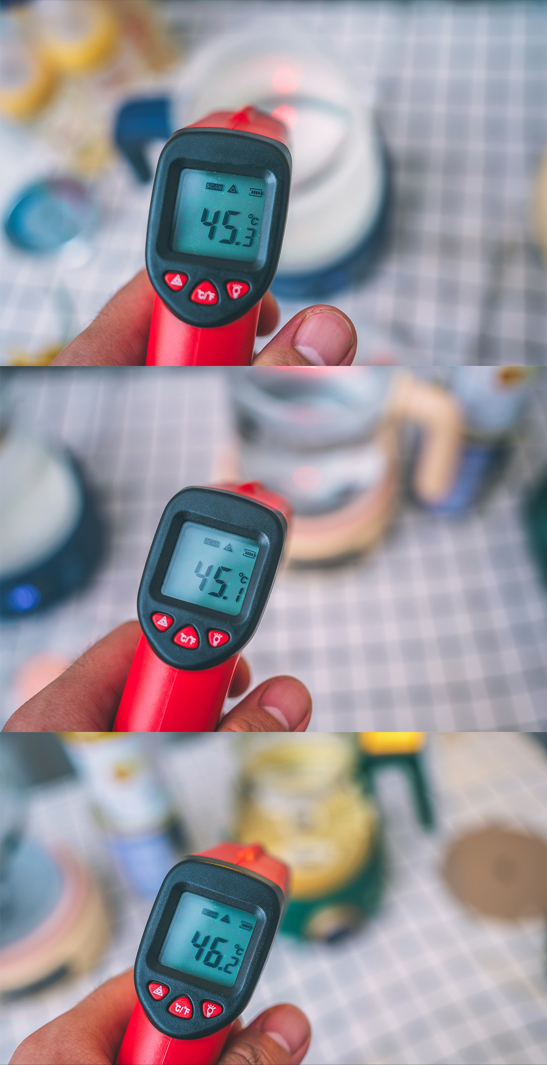 全都设置到45摄氏度,来看看效果。温度显示45之后,然后测试一下杯内壁温度情况。分别是西屋45.3℃、七彩叮当45.1℃、小白熊46.2℃。温差都在±1℃以内,温控效果都还是不错的!