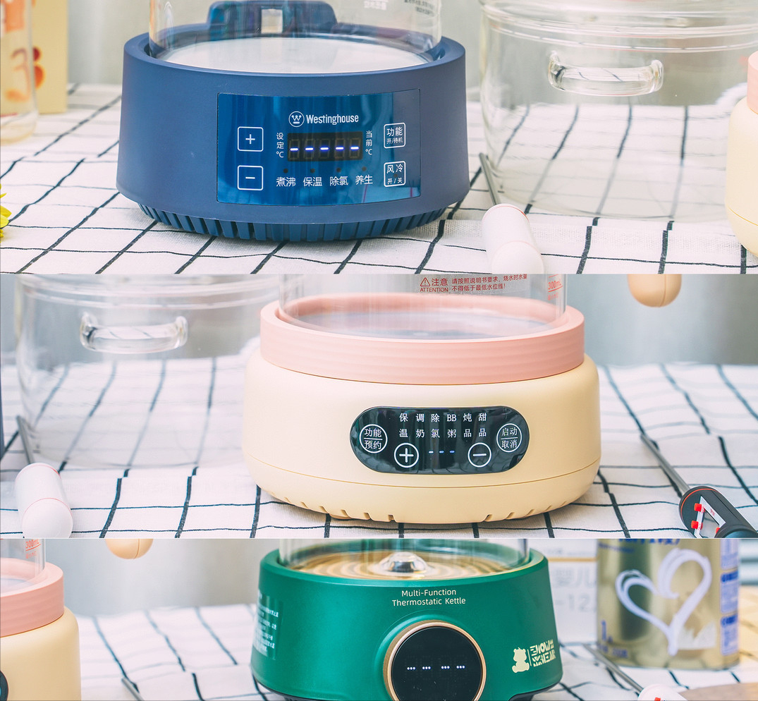 从左到右,西屋、七彩叮当、小白熊。从容量方面来看,西屋搭配1.2L高硼硅玻璃壶,七彩叮当搭配1.2L高硼硅玻璃(2mm加厚玻璃)壶+800mL高硼硅玻璃炖盅,小白熊的是1L玻璃壶。一般来说奶瓶单次用水250mL以内,所以1.2L和1L差距大概在一次冲泡之间,相对来说差异不是很大。不过考虑到其他使用情况,容量大一些要更方便。