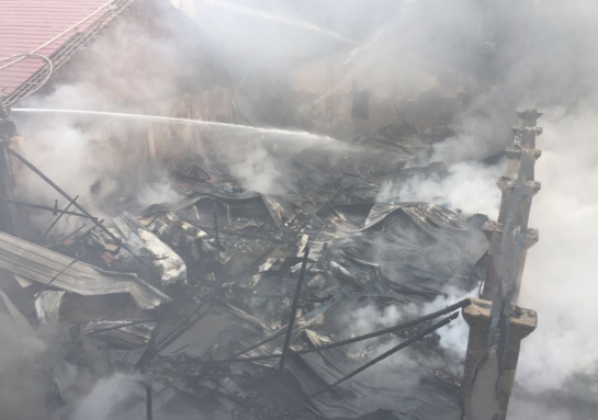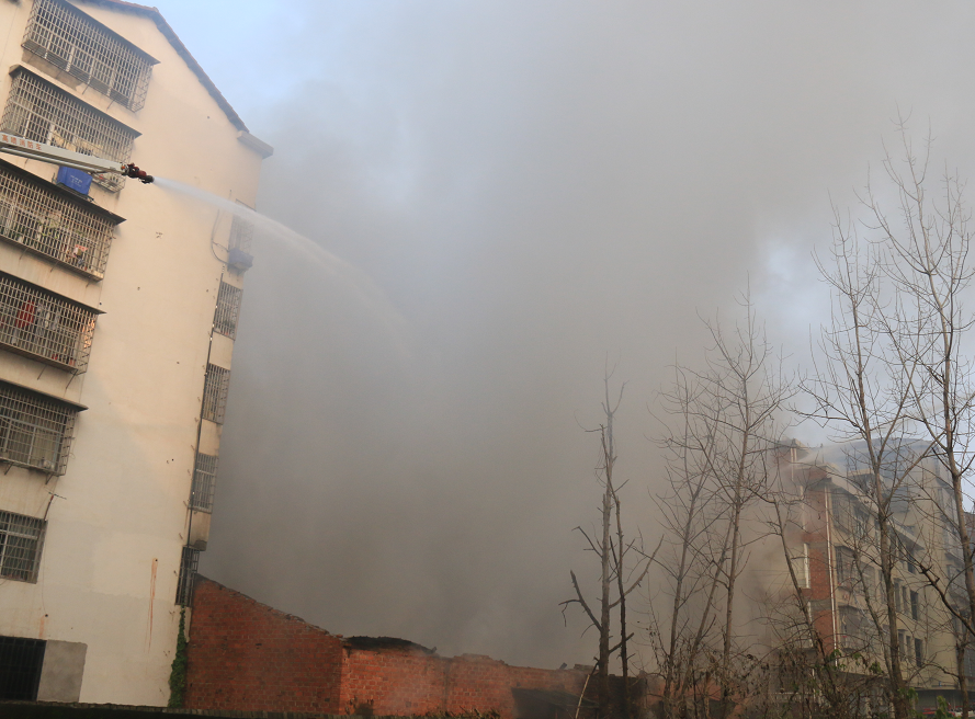 上午8时40分记者赶到现场时,消防官兵已经赶到现场,正在进行灭火。起火仓库冒出滚滚浓烟,仓库房顶已被烧塌,仓库内存放的货物已被基本烧光。临近起火仓库一侧的居民楼有不同程度烧损。