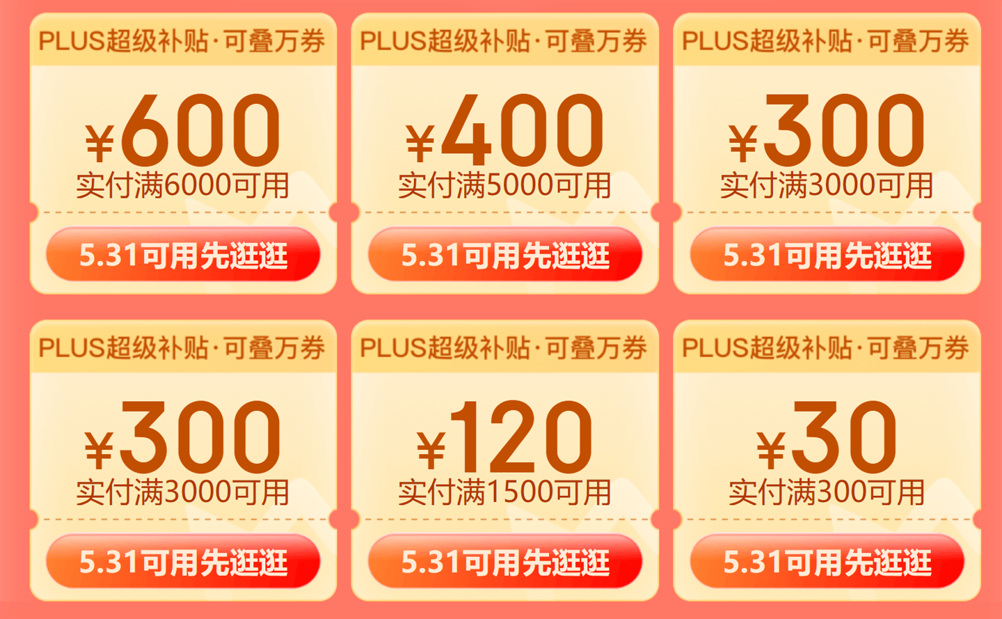 京东 PLUS 会员 618 超级补贴现已开放领取,会场内可领 6000-600 元 、5000-400 元、3000-300 元 * 2 张、1500-120 元、300-30 元,6 张超级补贴券(共计 1750 元),可叠加万券使用:点此进入领券会场。